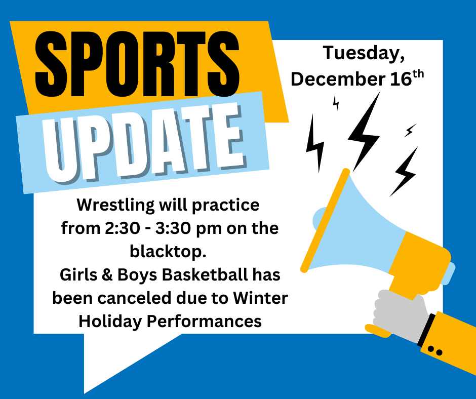 Attention Sierra Vista Athletes, Wrestling WILL practice on Tuesday. Boys & Girls Basketball has been canceled on Tuesday due to the Winter Holiday Concert. Thank you!
