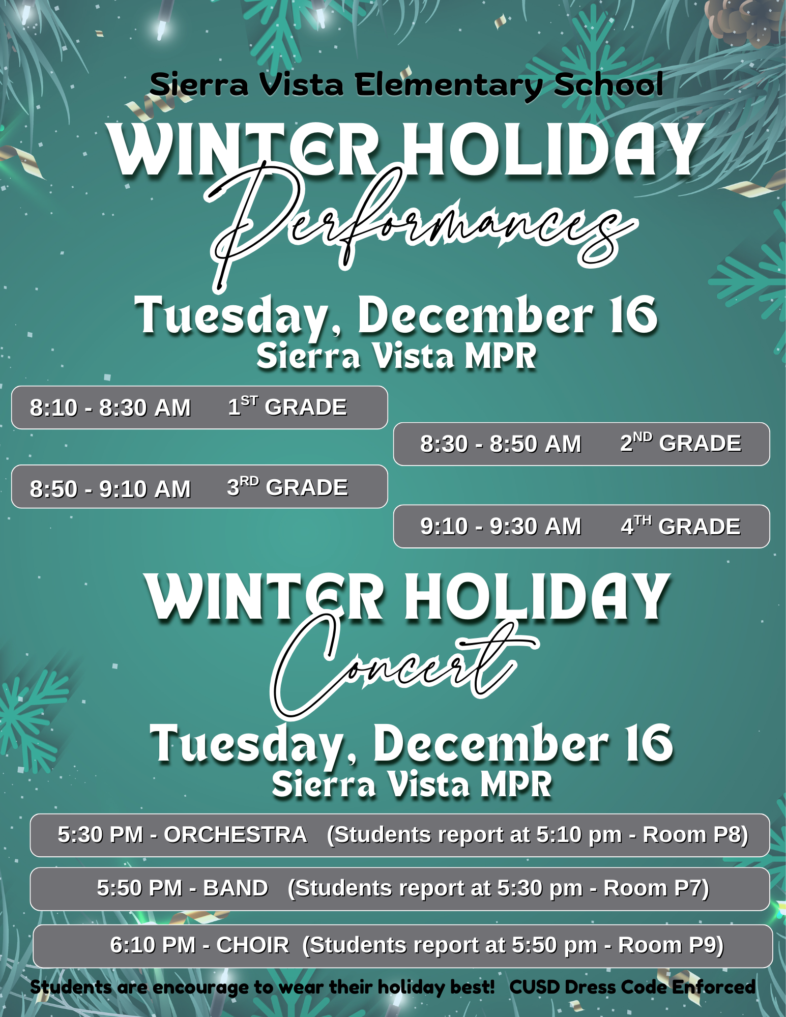 Sierra Vista families, On Tuesday, Dec. 16th we will have our Winter Holiday Performances in the morning for grades 1st - 4th. We will also have our Winter Holiday Concert for Band, Orchestra, and...