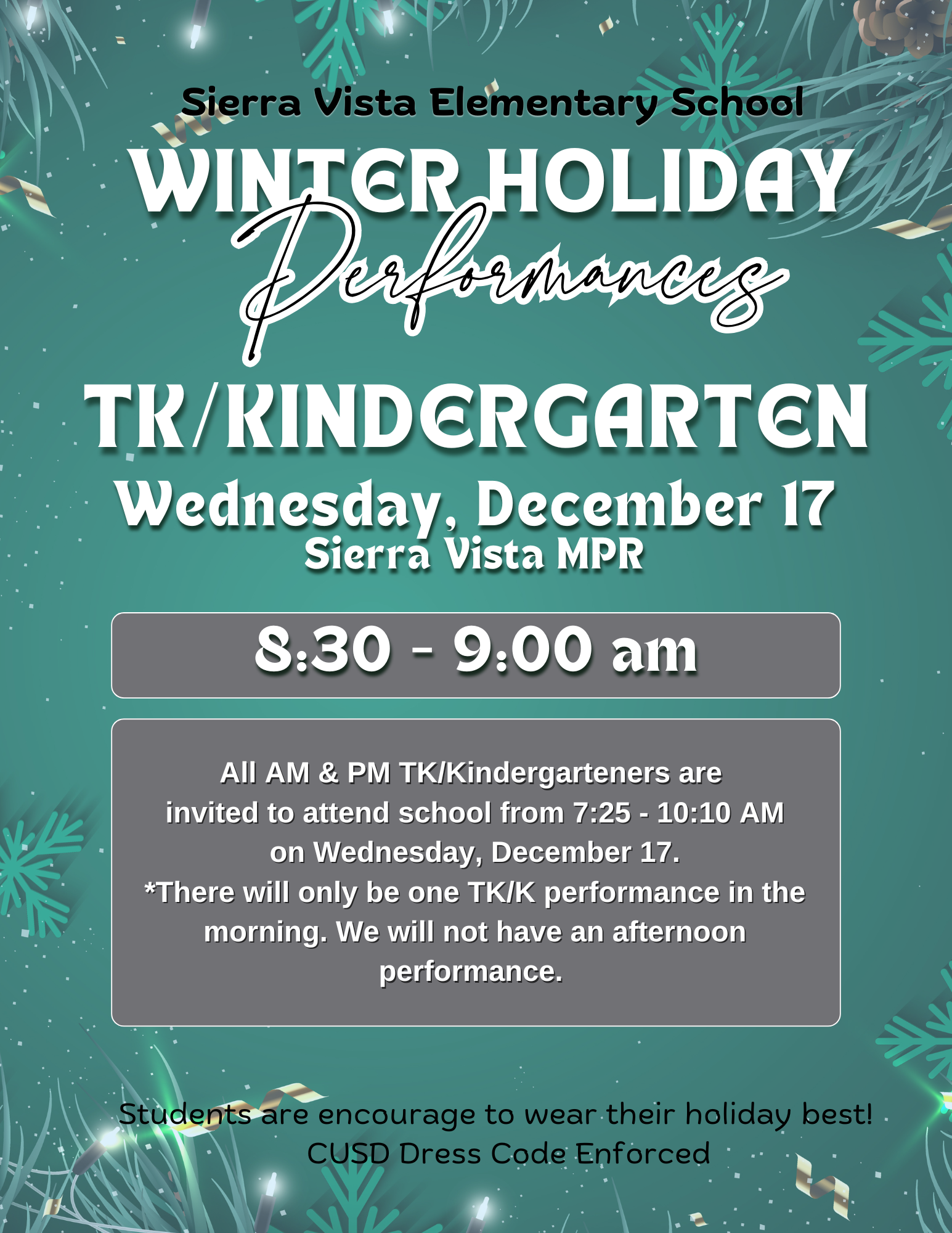 Sierra Vista families, All AM & PM Transitional Kindergarten and Kindergarten families are invited to attend the Winter Holiday Performance on Wednesday, December 17th. There will not be a PM ...