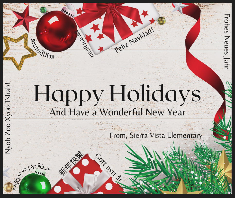 Wishing our students, families, and our staff, "Happy Holidays and have a wonderful Happy New Year"! Please take care of yourself, take care of each other, and take care of Sierra Vista Elementary especially during winter break. See you all on January 7, 2025! School starts at 7:40am. Go Vikings!